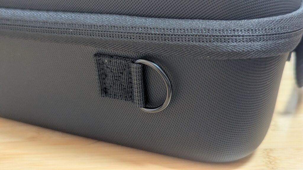 持ち手もしっかり作られていて好印象。サイドには付属のストラップを取付けるD缶があります。