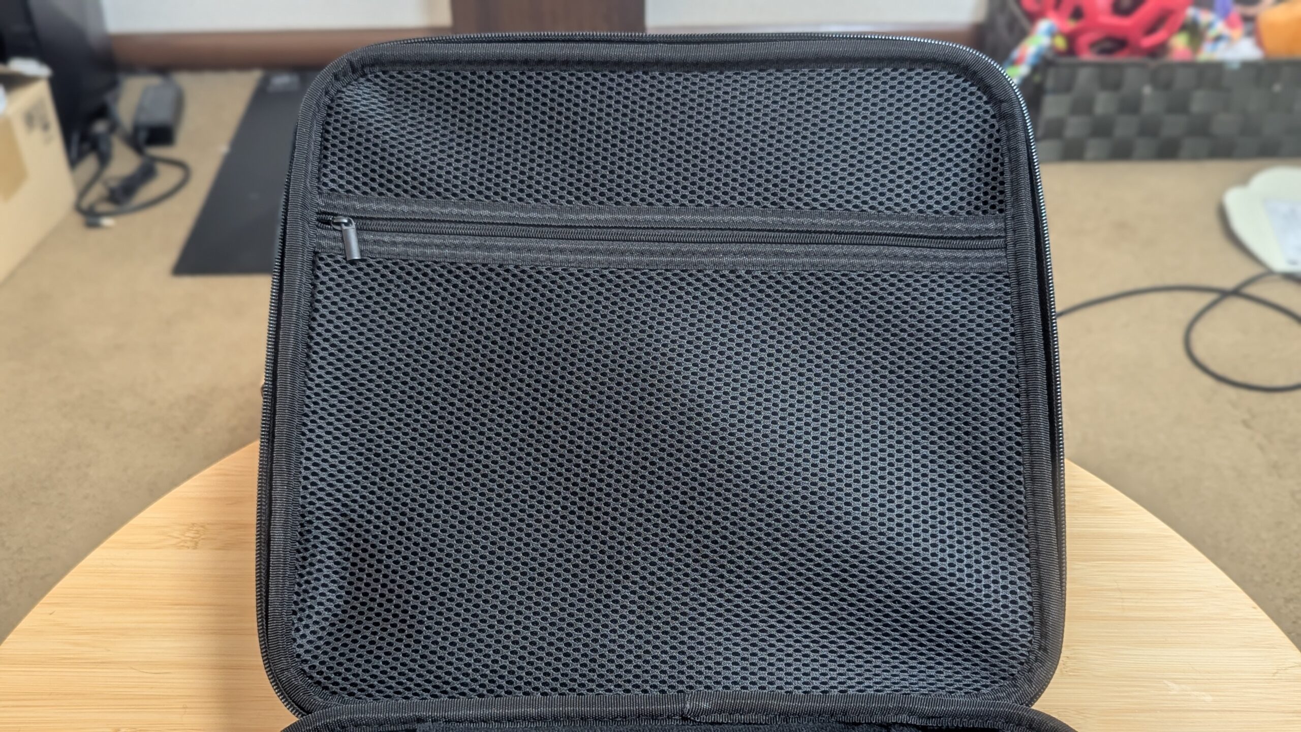 Amazonで見つけた他のケースは、本体とケーブル類を横に並べることで薄くなる反面、面積が大きくなりがちです。