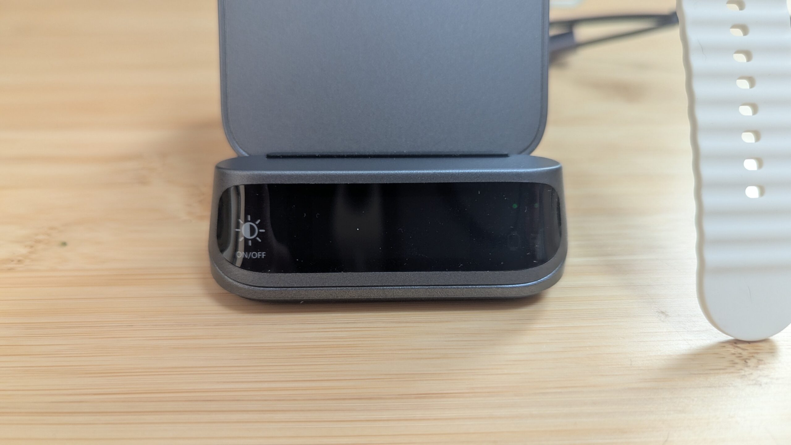 本来であれば時計の右側にアイコンが3つ、それぞれの上に緑のLEDが点灯するはずですが、アイコンは非表示、LEDはうっすら表示される状態です。
